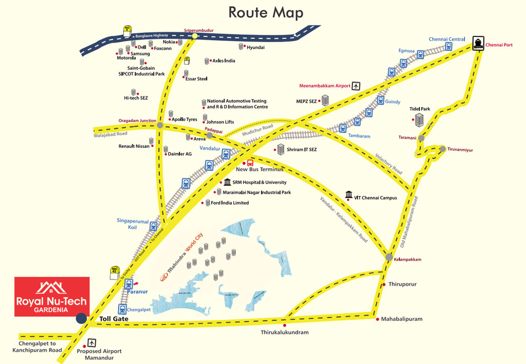 GST is well connected to ECR and OMR along with CBH (Chennai - Bangalore Highway) which are the two major arterial roads of Chennai & Chengalpet to see the biggest IT boom. With the increasing number of IT parks and very good connectivity to other parts of city there has been a massive demand for homes at chengalpet. The proposed International Airport at Mamandur, Elevated Express Highway Tambaram - Chengalpet and 8 Lane road widening from Chengalpet - Tindivanam likewise will boost the demand for homes in GST Road Stretch. Social infrastructure along this corridor is rapidly growing with World Class International Schools, Renowned Multi Speciality Hospitals, Reputed Engineering Colleges, Fortune 100+ Automobile & Manufacturing Companies, & Leading Retail Brands. The Royal Nu-Tech Project is strategically and centrally located alongside the rapidly developing social infrastructure.